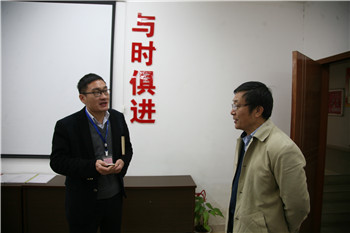 南昌欧菲光科技公司高级经理胡海波向我院执行院长高益庆介绍学生在岗的基本情况