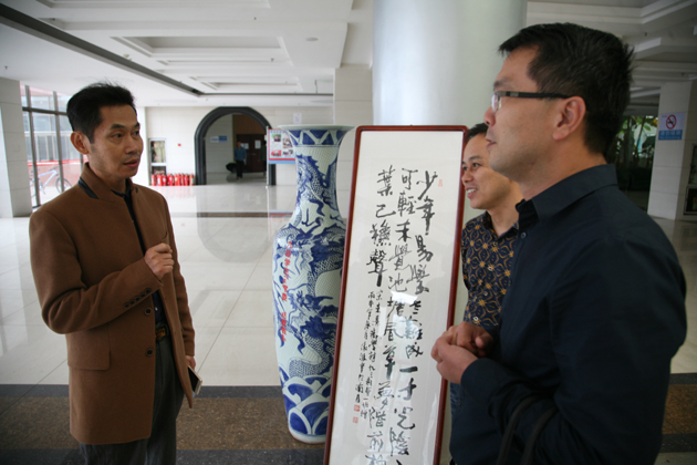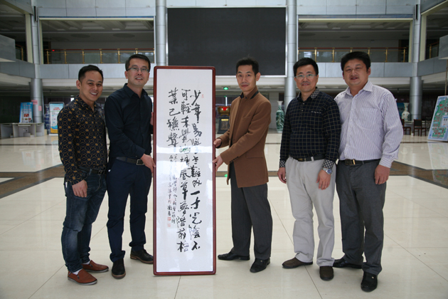 万绍文、熊绍书两位校友到达母校后,我院副院长、校友会常务副会长章志伟,图书馆副馆长、校友会常务副秘书长王海伦和校友会副秘书长兼校友办主任黄肃新陪同两位校友参观我院的图书馆和校史馆,两位校友对母校的发展感到由衷的高兴。为表达对母校的感激之情和对老师的感恩之心,两位校友代表全班同学向母校赠送了著名书法家王淑波(号布衣叟)的书法作品。作品内容为宋代朱熹的《劝学诗》:“少年易老学难成,一寸光阴不可轻。未觉池塘春草梦,阶前梧叶已秋声”。两位学长希望学妹学弟珍惜美好时光,刻苦学习,学有所成后用实际行动为祖国作出更多的贡献。