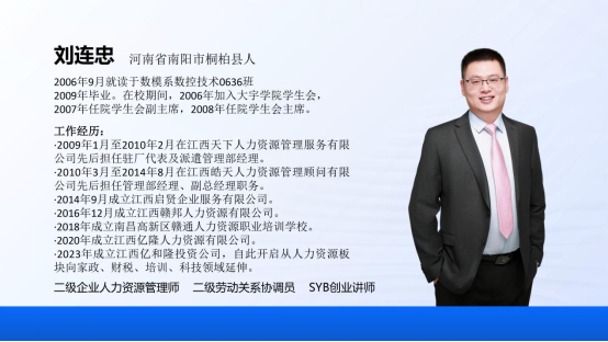 刘连忠2009年毕业于我校数模系数控技术0636班,在校期间曾任院学生会主席。毕业后深耕人力资源行业,从基层岗位起步,2014 年开启创业之路,先后创办多家企业,如今已构建起跨人力资源、家政、财税等多领域的集团化运营格局,身兼二级企业人力资源管理师、SYB创业讲师等多重资质。